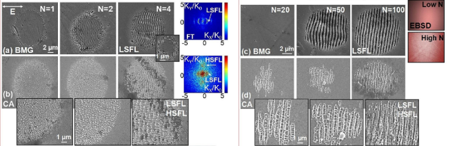 圖 1.以F=0.38 J/cm2(a,b)和F=0.15 J/cm2(c,d)的線性偏振激光(guāng)脈衝輻(fú)照後BMG(a,c)和CA(b,d)樣品表麵的掃(sǎo)描電鏡圖(tú)像。插圖中顯示了CA形狀的放(fàng)大區,以及BMG表麵(miàn)無定形(xíng)和(hé)結晶(jīng)相的EBSD結構評估。較高通量值(N=1,2,4)時(shí)使用(yòng)的脈衝數較少,而較低通(tōng)量情況下使用的脈衝數較多(N=20,50,100)。(a)中的插圖給出了在N=4時較高通量F=0.6 J/cm2的例子。LSFL表示通常垂直於激(jī)光偏振(zhèn)方向形(xíng)成的LSFL波紋。(a,b)中給出了BMG和CA情況下N=4脈衝時LIPSS的(de)二維傅立葉變換(huàn)(FT)表示法,顯(xiǎn)示了LSFL和HSFL的(de)發展及(jí)其在(zài)空間-頻率空間(K空間)中的特定(dìng)空間周期性。
