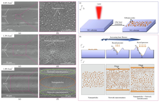 對此,他們還(hái)對這種結構(gòu)的形成(chéng)及演化(huà)進行了討論(如圖2所示),能量相(xiàng)對較低時,納米粒子以離散形式出現在照射區域;當(dāng)將能量增(zēng)加時,除熱影響區(qū)外,照射(shè)區(qū)域呈現出大麵積的網絡納米(mǐ)結構。這些網絡納米結(jié)構並不總是(shì)完全封閉的,尤(yóu)其是在輻照區域的中心。隨著能量進一步增加,整個輻照(zhào)區域具有熱(rè)影響區周圍的網絡(luò)納米結構和位於輻照區域(yù)中心的納米(mǐ)顆粒兩種結構。並且,隨著激光能量密度的增加,這種納米粒子的數量(liàng)不斷增多,當數(shù)量過多時兩兩(liǎng)相互連接形成納米線,或者納米網格結構,納米顆粒可歸因於激光誘導的元素富集(即無定形氧化鉺)及其與基材的潤濕性不匹(pǐ)配。此外,在反衝壓力和表麵形貌的共同影響下,納米粒子(zǐ)的擴(kuò)散(sàn)和連接會導致網絡納米結構的形成。這種納米顆粒(lì)和納米網(wǎng)格的應用十分廣(guǎng)泛,如作為增(zēng)強材料等。