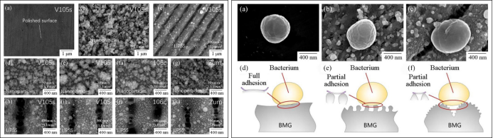 圖3.左圖為:飛秒激光納米結構表麵的(de)形貌(mào):(a)V105s的拋光表麵;(b)V105s的納米粒子結構表麵;(c)V105的LIPSS;(d-g)Zr-BMGs的納米顆粒結(jié)構表麵;(h-k) Zr-BMG的LIPSS。右圖為:金黃色葡萄球菌(jun1)在(a)拋光表麵、(b)納米顆粒結構表麵和(c)LIPSS上的表麵接觸狀(zhuàng)態。表麵細菌粘附狀態示(shì)意圖(d)在拋光表麵上,(e)在納米結構表麵上和(f)在LIPSS上(shàng)。