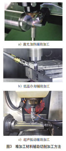 低溫冷卻輔(fǔ)助加工[10](見圖3b)則是使用液氮、高壓二氧化碳(tàn)氣體等冷卻介質(zhì)噴塗到(dào)切削部位,對切削加工過程進行冷卻,避免因(yīn)為材料導熱性能差引起的局部切削溫度過高問題(tí),還使得工(gōng)件局部冷脆(cuì),增(zēng)強斷屑效果。英國(guó)的Nuclear AMRC公司成功使用高壓二氧化碳氣(qì)體對鈦合金(jīn)的加工過程進行冷卻,與幹切削狀(zhuàng)態對比分析表明,低溫冷卻輔助加工不僅能夠(gòu)降低切削力(lì),提高切削加(jiā)工表麵的質量,還能有效減小刀具磨損,增(zēng)長刀具的使用壽命。此外,超聲振動輔助加工[11,12](見圖3c)也是難(nán)加工材料(liào)高效切削加工的有(yǒu)效方法。通過在刀具上施加高頻(pín)、微小幅度的振動,實現加工過程中刀具與工件之(zhī)間發生間斷性分離,改變了材料去除機理,增(zēng)強了動態切削的穩(wěn)定性,有效(xiào)避(bì)免刀具與已加工表麵間的摩擦,降低切削(xuē)溫度和(hé)切削力(lì),降低表(biǎo)麵粗糙度值,減小刀具磨損,其優良的工藝效果已經得到廣泛的關注。