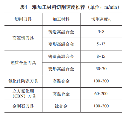 切(qiē)削參數(shù)同樣(yàng)是影響加工效果的重要因素,對應材料使用合適的切削參數(shù)加工能夠有效(xiào)提高加工質量與效率。以切削速(sù)度參(cān)數為例,切削速度(dù)低容易在材料(liào)表麵形成積屑瘤區,降低表麵加工精度;切削速度高容易發生熱(rè)量積聚,引起工件和(hé)刀具的燒傷。對此,哈爾濱理工大學翟元盛教授團隊分(fèn)析常(cháng)用難加工材(cái)料的(de)機械物理性質,通過正交加工試驗(yàn)總結出難(nán)加工材料切削速度推薦(jiàn)表[14](見(jiàn)表1),使用表中(zhōng)推薦的刀具和(hé)切(qiē)削速度進行加工能(néng)夠有效減小加工缺陷與刀具磨損,提高加(jiā)工質量。