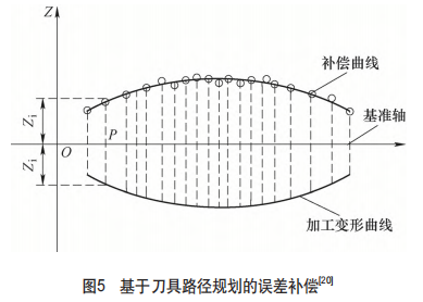 基於上述的預測模型或在機測量技術,人們能夠對加工參數進行優化甚至是實時調控。主流(liú)的方向是通過刀具路徑的重新規劃來對變形和振動造成的誤差進行補償。這一方向常用(yòng)的方法是“鏡像補償(cháng)法”[20](見圖5),該方法通過對名義刀具軌跡進(jìn)行修正(zhèng),補償單次切(qiē)削的變形量。但是單次補償會產生新的加工變形,因(yīn)此需要(yào)通過多次補償在切削(xuē)力(lì)和(hé)加工變形之間建立迭代關係,逐次修正變形量。除了基於刀具路徑規劃進行主動誤差(chà)補償的方法之外,許多學者也在研究通過優化調控切削參數、刀具參數等方式來控製(zhì)變形和振動。對於某型號航空發動機葉(yè)片的切削加工,改變加工參數進行多輪正交試驗,基於試(shì)驗(yàn)數(shù)據分析各切削參數、刀具(jù)參數對葉片加工變形、振動響應的影響規律(lǜ)[21-23],建立經驗預測(cè)模型,從而優選加工參數,有效減小