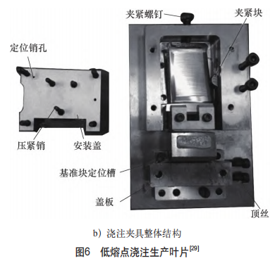 航空(kōng)發動機葉片傳統加(jiā)工工藝中的(de)工藝裝備是使用低熔點合金等相變(biàn)材料(liào)進行填充輔助支撐,即對工件毛坯進行六點定位夾持後,將工件的定位基準通過低熔點合金澆注成為一個澆注塊,對工件進行輔助支撐,並且把複雜的點定位轉換成規則的麵定位,進而進行待加工部位的精密加工(見圖6)。這種工藝方法存在(zài)明顯(xiǎn)的缺陷:定位基準轉換(huàn)導致定位精度下降;生(shēng)產準備複雜、低熔點合金的澆注和融化也帶來了工件表麵的殘留和清理問(wèn)題,同時澆注和融化的工況也比較惡劣[30]。為了解決上述工藝(yì)缺陷,常用(yòng)的方法是引(yǐn)入一(yī)種多點支撐結構與相變材料相結合[31],支撐結構上(shàng)端與工件接觸進行定位,下端浸入低熔點合金腔室中,基於低(dī)熔點合金的相變(biàn)特性實現柔性輔助支撐。雖然引入支撐結構能夠避免低(dī)熔點合金接觸葉片產生的表麵缺陷,但(dàn)是受到相變材料的性能限製,相變柔性工裝無法同時滿足高剛(gāng)度和高響應速度兩大需求,難以應用於高(gāo)效(xiào)率自動化生產當(dāng)中。