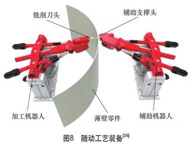目前在(zài)工藝裝備設計過程中,普遍使用有(yǒu)限元分析、遺傳算法等手段來優化(huà)多點輔助(zhù)支撐的布(bù)局[35],但是優化的結果(guǒ)通常隻能(néng)保證在一點上的(de)加工變形量達到最小,而並不能保證在其他加工部位也能起到(dào)同等的抑製變形效果(guǒ)。在葉(yè)片加工過程中,通常在同一機(jī)床(chuáng)上對工件進行(háng)一係列的走刀加工,但加工(gōng)不同部位的裝夾需求是不同的,甚至可能(néng)是時變的(de)。對於靜態多(duō)點支撐方法,如果通過增加輔助(zhù)支(zhī)撐的數量來(lái)提高工(gōng)藝(yì)係統剛(gāng)度,一方麵會增大工裝的質量和體積,另一方麵也壓縮了刀具的運動(dòng)空間。而如果在加工不同部位時重新設置輔(fǔ)助支撐的位置(zhì),則必然會中斷(duàn)加工過程,降低加工效率。因此,根據加工過(guò)程自(zì)動在線調節支撐布局和支撐力的隨動工藝裝備[36-38]被提出。隨動工藝裝(zhuāng)備(見圖8)能夠在(zài)任一加工工序(xù)開始前,基於時變切削過程的刀具軌跡與工況轉變(biàn),通過刀具與工裝(zhuāng)的協同配(pèi)合實現動態支撐:先將輔助支撐移(yí)動到有助於抑製當前加工變形的位置,使工件的加工區域(yù)受到積極支撐,而工件其他部位在盡可能少的接觸下保持定位不變,從而匹配加工(gōng)過程中時變的裝夾需求。