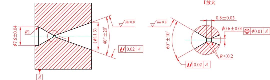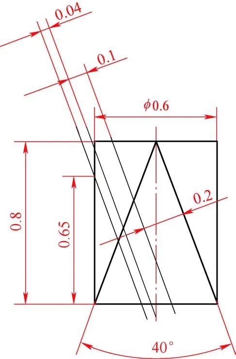 3)線切割雙內錐孔與(yǔ)微小孔時易產生相互幹涉。線切割加工(gōng)40°±20′錐孔後,φ(0.6±0.01)mm微(wēi)小孔長度(0.8±0.03)mm易產(chǎn)生過切(見圖3),長度超(chāo)差。加工40°錐角時,主(zhǔ)切偏(piān)移量為0.1mm,再加上0.04mm放電間隙,當電極絲傾斜(xié)20°時,影響φ0.6mm微小孔60°方向孔口到60°端麵距離。