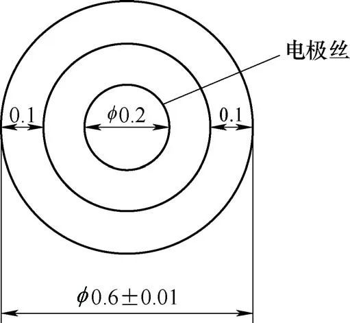 2)高精度內孔與外圓的同軸度要求高。陽極兩端雙內錐孔和中間(jiān)微小孔需要與外圓保證同軸度(dù)φ0.01mm以內,結構之間才能較好過渡,從(cóng)而避免出現結構錯位。為保證後續線切割能加工內孔成形,穿絲孔需要單邊留餘量≥0.1mm,φ0.2mm電極(jí)絲與放電間隙(xì)之和需要≥0.25mm,避免(miǎn)慢走絲加工時,因電極絲(sī)裝(zhuāng)夾偏離穿絲孔中心較大而(ér)造成短路。φ(0.6±0.01)mm內(nèi)孔的穿絲(sī)孔孔徑最大可達φ0.4mm。線切割絲徑與內孔如圖2所示。穿絲孔為深徑比達57的深小孔,並要求與外圓的同軸度<φ0.10mm,可避(bì)免φ(0.6±0.01)mm內孔(kǒng)加工後留下穿絲孔痕跡。
