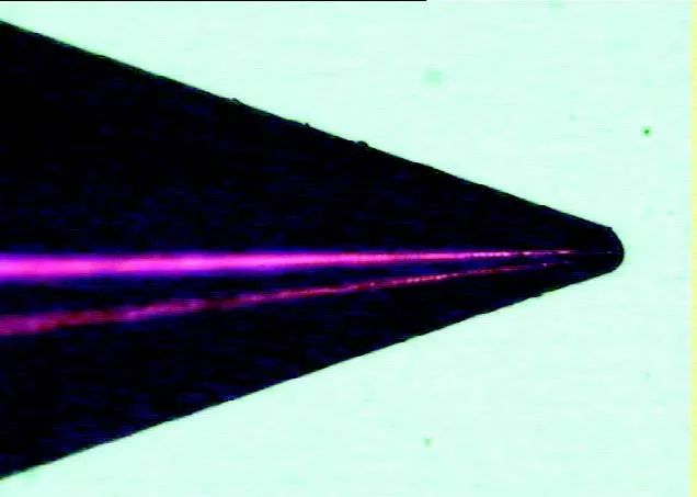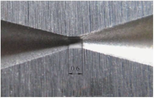 針對慢走絲線切割錐麵時φ (0.6±0.01)mm內孔(kǒng)幹涉問(wèn)題,采取(qǔ)加工時φ 0.6mm兩端孔口到(dào)端麵(miàn)距離分別留餘量0.2mm的措施。此時(shí)錐(zhuī)角需加工至24°。然後其餘錐孔尺寸和內孔長度轉至電火(huǒ)花成形加工(gōng)。線切割後中心微小孔形(xíng)貌(mào)如圖5所示(shì)。