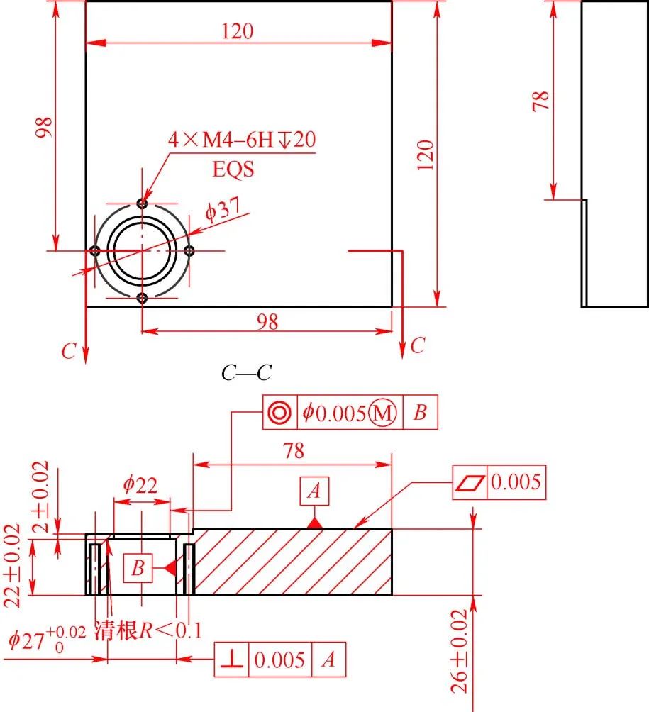 1)由於工裝裝配孔內徑27mm加工過程中存在讓刀(dāo)現象,導致裝配孔底端有輕微錐角,與底(dǐ)麵基準麵不垂直,陽極裝配不到底麵。
