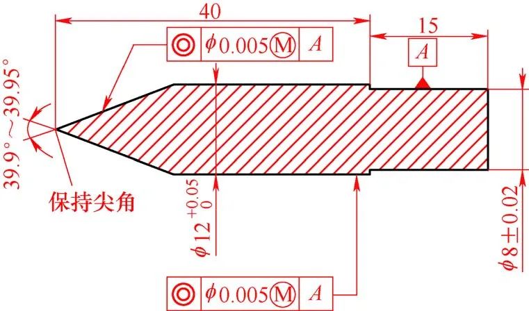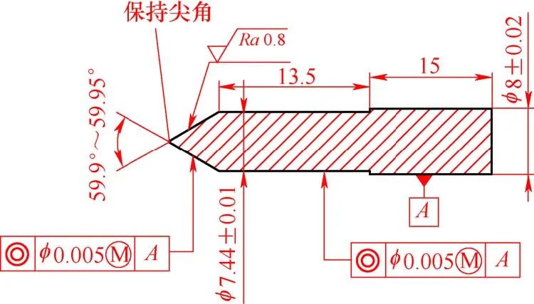 陽極材料為WRe25鎢錸(lái)合金,外圓和端麵(miàn)對幾何公差(chà)要求較高,內部結構加(jiā)工要求也較嚴格,內錐孔錐角40°±20′和60°± 10′、φ(0.6±0.01)mm微小孔(kǒng)與(yǔ)外圓同軸度φ0.01mm以內(nèi),φ(0.6±0.01)mm微小孔長度(0.8±0.03)mm,錐孔(kǒng)角度(dù)公差最嚴要求為±10′,表麵質量達到表麵粗糙(cāo)度值Ra<0.8μm。陽極如圖1所示。