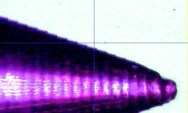 加工後的陽極經過微小孔、雙錐孔及表麵質量檢測,全部滿足圖樣要求,微小孔實測值為φ0.603mm,與外圓同軸度為φ0.008mm,錐麵全(quán)跳動最優可達0.006mm。陽極檢(jiǎn)測值見表2,陽極(jí)外觀(guān)如圖10所示。