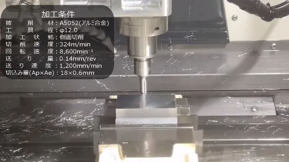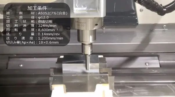 A5052鋁合金工件(jiàn)進行側麵切削加工,使用直徑12mm銑刀(dāo),加裝在新產品NAKANISHI高速電主軸BMS-5010進行(háng)加(jiā)工,下麵鬆本機電就來簡單展示加工時參數。