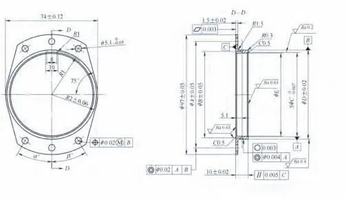 圖1為法蘭盤軸承整體結構。法蘭盤是法蘭盤(pán)軸承實現小遊隙和自調心功能的(de)重(chóng)要零部件,其自身(shēn)的尺寸精(jīng)度和幾何公(gōng)差對整個軸承的使用功能起著決定性作用。法蘭盤內球(qiú)麵的加工精度和安裝孔位的定位精度,直接決定了軸(zhóu)承(chéng)的使用壽命(mìng)和性能,同時影響裝配後與整個軸承的調心能力的強弱(ruò)和偏轉力矩的大小。而調心能力、偏轉力矩和遊隙大小(xiǎo)直接影響組件功能的實現。為了滿足法蘭盤軸承的整體(tǐ)功能需求,提高自(zì)身精度等(děng)級,設計人員對法蘭盤的機械加工提出了更加嚴苛的(de)要求。