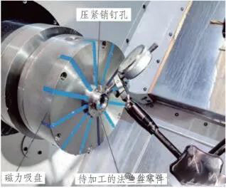 若在零件粗加工階段,使用退火處理後的棒料(liào),將外徑和端麵光(guāng)整後裝夾外徑,一次(cì)裝夾進行內徑打孔和(hé)擴孔,再進行小外徑的切削,通過熱處理(lǐ)應力釋放後,再(zài)進(jìn)行後續零件半精加工和精加工,可以(yǐ)保證應力釋放條件下零(líng)件的加工精度;若采用磁力吸盤和定位銷釘配合裝夾(jiá)的方式,能夠實現軸向壓緊的無徑(jìng)向力裝夾方式(shì),可以大大減小加工過程中由於裝夾力(lì)產(chǎn)生(shēng)的法蘭盤徑向形變,提高機械加工的尺寸精度和幾何(hé)精度,保證零件加工(gōng)的最終效果。