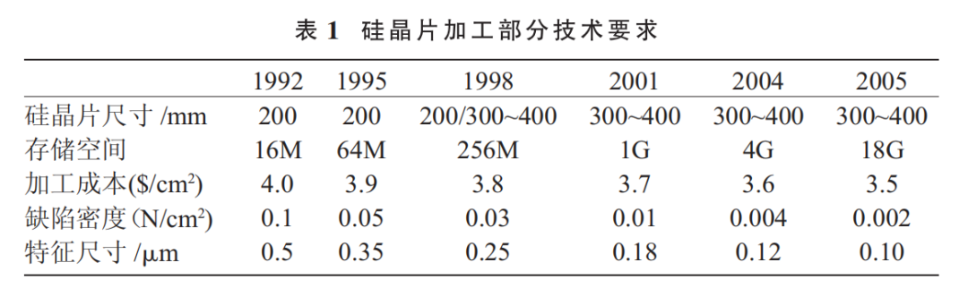 另外(wài),在現代國防和軍事方麵,電子信息化武裝的武器裝備在現代戰爭中發揮著越來越重(chóng)要的作用,甚至起著決定戰爭勝(shèng)負的關鍵性作用。所有這一切的(de)發展和需(xū)要(yào),都(dōu)是建立在半(bàn)導體(tǐ)矽材料的基礎之上。半導體(tǐ)矽材料是半導(dǎo)體工業最重要的(de)主體功能(néng)材料,是(shì)第一大功能電子材料,至今全球矽(guī)材料(liào)的使用仍占半導(dǎo)體材料總量的95%以(yǐ)上。矽材料、矽器件和矽(guī)集成電路的發展與應用水平早已成為一個國家的國力、國防、國民經濟(jì)現代化及人民生活水(shuǐ)平(píng)的重要標誌。集成電路自 1959 年發明以來,集成電路芯片 的集(jí)成度在不斷提高,而加工特征尺寸和加工成 本逐步縮小[2],如表 1 所示。