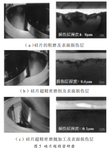 圖 5(a)、圖 5(b)、圖 5(c)為矽片的粗磨、超精密磨削和超精密磨拋加工(gōng)及其表麵損傷層。