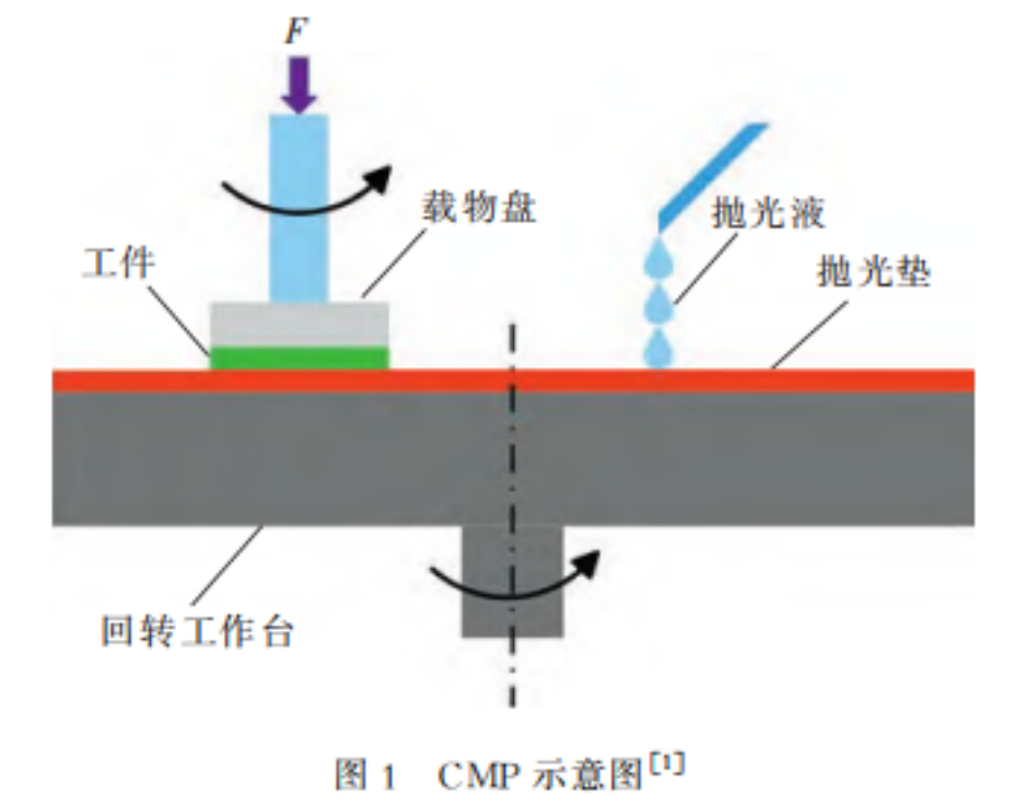 在拋光(guāng)過程中,工件表麵與拋光液接觸,發生(shēng)化學反應,生成軟質層。工件在壓力(lì)作用下與(yǔ)拋光墊相對運動,其表麵(miàn)的軟質層被拋光液(yè)中的磨料劃(huá)擦去除。CMP示意圖如圖1所示,圖中F為壓力。