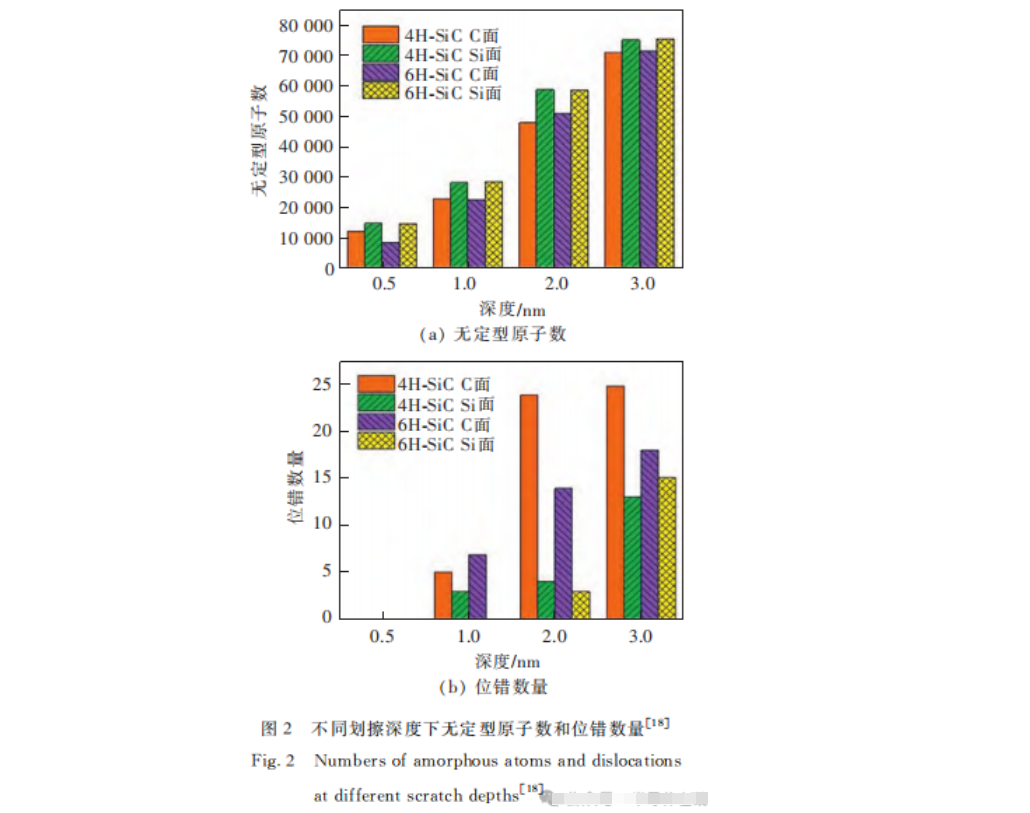 2020年,Z.G.Tian等人采用分子動力學模擬方法,對4H-SiC和(hé)6H-SiC的C麵和Si麵(miàn)進行了劃痕實驗,研究表明,與Si麵(miàn)相比,C麵(miàn)的非晶態變形更(gèng)少,材料(liào)的去除更有(yǒu)效,這種劃痕現象與SiC晶體基麵上的位錯有關。圖2為(wéi)不同試件在不同劃(huá)擦深(shēn)度下無定型原子數(shù)和位錯數量。2021年,P.Zhou等人采用分子動力學方法(fǎ)研究了多(duō)磨粒隨(suí)機分布的固結磨料拋光SiC基片的(de)表麵形貌、亞表麵損傷(shāng)特(tè)征。結果表明,多磨粒在單一粗糙麵中的暴(bào)露高度和(hé)磨粒分布決定了SiC襯底(dǐ)的去除行為;金(jīn)剛石顆粒在固結磨料拋光(guāng)墊中(zhōng)的隨機分布會使加工質量變(biàn)差。