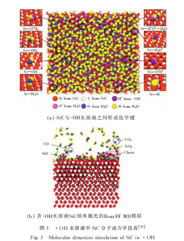 在(zài)CMP中(zhōng)除了存在(zài)與機械拋光相似的磨料劃擦作用外,化學作用的影響也至關重要。2021年,孫強采用分子動(dòng)力學方法分別模擬了(le)CMP中金剛石和SiO2磨粒對SiC表麵原子去除機製。結果(guǒ)表明,SiO2在(zài)拋光過程中比金剛石更容易發生化學反應,原因是其通過與SiC表麵原子持續成鍵和斷鍵來實現原子去(qù)除。2023年,Z.W.Yuan等人(rén)研究了SiC在羥基自由基(·OH)水溶液中的原子行(háng)為。結果表明,在(zài)隻發生(shēng)化(huà)學氧化的情況下,SiC表麵吸附O、H、·OH生成Si—OH2、Si—OH、Si—H2O和Si—H等,Si原子未曾從SiC表麵脫離,如圖3(a)所示。而在機械作(zuò)用下(xià),部分Si和C原子以SiO、SiO2、CO、CO2或鏈狀結構脫離(lí)基體(tǐ),其餘Si和C原(yuán)子則以吸附方式脫離基體,如圖3(b)所示(shì)。這些研究有助於從原子層麵上解釋CMP中原(yuán)子氧化去除的動力學過程,為揭示(shì)材料去除機理提供了一種(zhǒng)有價值的方法。
