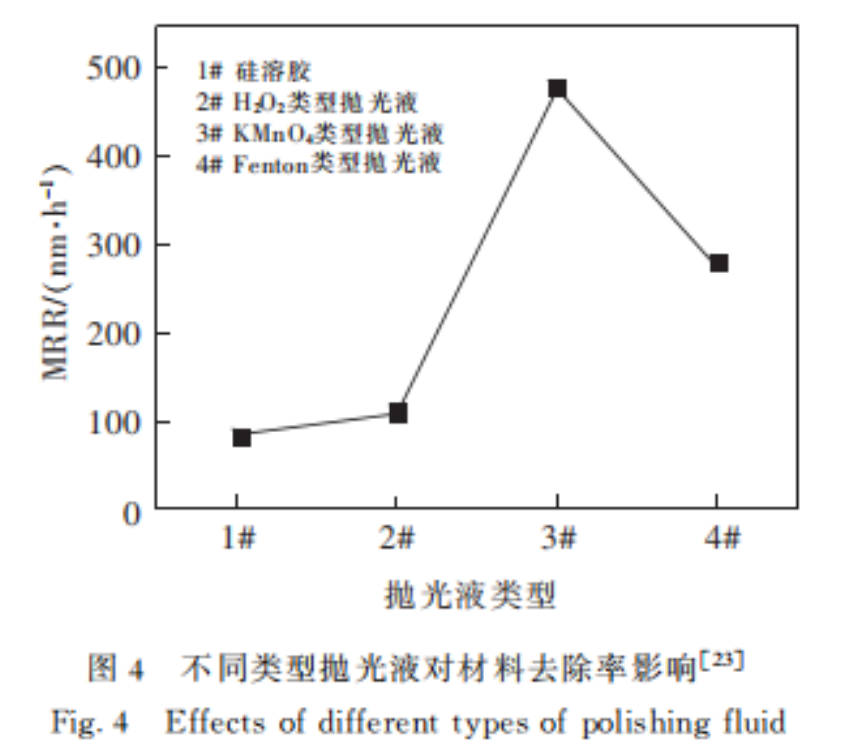 在目前(qián)的報道中,對於拋光液的研究思路包括改變氧化劑的種(zhǒng)類和濃(nóng)度、溶液pH值、分散劑、磨料等方法。通過調節拋光液中不同成(chéng)分的含(hán)量,控製機械磨損與化學反應之間的平衡,對獲得高MRR和無原子平(píng)麵缺陷的表麵起著(zhe)關鍵作用。