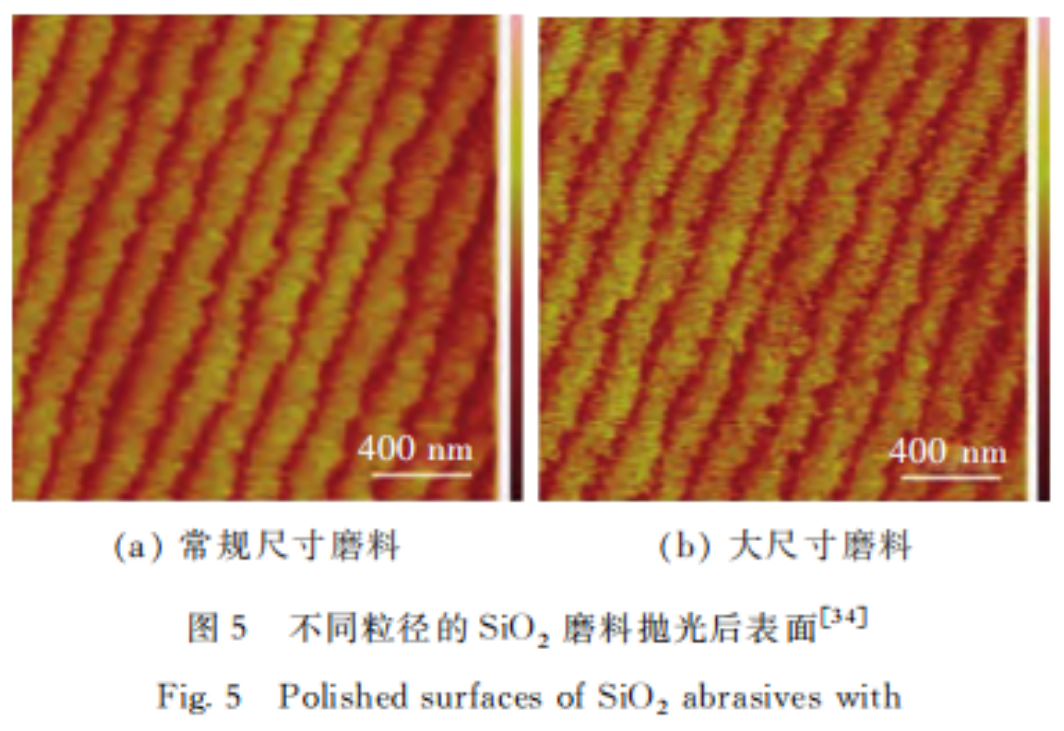 此外,也研(yán)究了(le)不同粒徑的同種磨料對(duì)機械作用的影響(xiǎng)。2014年,X.L.Shi等人詳細分析了不同磨料粒徑的矽(guī)溶膠對4H-SiC晶圓拋光性能的影響。通過理論推導和實驗分析得出,當磨料粒徑較大時會導致不規則的平台邊緣。反之,如果磨料粒徑較小,材料(liào)的去除將更規則,並(bìng)且平台邊緣將(jiāng)更平坦和光滑,指出磨料粒徑是決定CMP效率和晶圓表麵最終平(píng)坦化質(zhì)量的重要因素。圖5所示(shì)為不同粒徑SiO2磨料拋光後的表麵,其中常規尺寸磨料平均粒徑30.8nm,大(dà)尺寸磨料平均粒徑79.3nm。