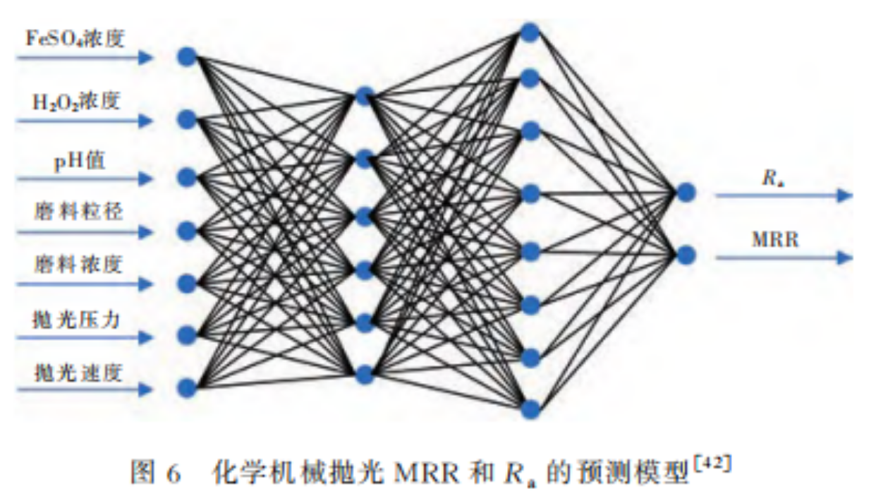 工藝參數與(yǔ)MRR、Ra之間的關係也(yě)可以通過建立模型來進行預測,為SiC的CMP加工提供參考(kǎo)。2021年,J.Y.Deng等人基於改進的Preston方程,研究了工藝參數對SiC拋光MRR和Ra的影響,並利用(yòng)反向(xiàng)傳播神經網絡建(jiàn)立了MRR和Ra的(de)預測模型,如圖6所示。結果表(biǎo)明,隨(suí)著FeSO4質量(liàng)分數、H2O2質量分數和pH值的升高,MRR呈先升高後降低的趨勢,拋光後Ra呈先降低後升高的趨勢(shì)。隨著磨料粒(lì)徑、磨料濃度(dù)、拋光壓力和拋光速度的增加,MRR不斷增大。Ra隨磨料粒徑和磨料濃(nóng)度的增加而(ér)不斷減小,隨著拋光壓力的增加而增大(dà),隨著拋光速(sù)度的(de)增(zēng)加而先減小後增大。不難看出,在SiC單晶的CMP中通過工藝(yì)優化,對拋光效果(guǒ)起到了一定的改善和(hé)提(tí)高作(zuò)用。