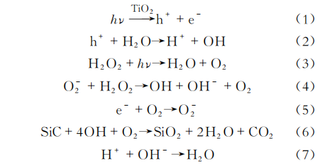 光催化化(huà)學(xué)機械拋光(PCMP)示意圖如圖7所示。將單晶SiC工(gōng)件粘貼在拋光頭底(dǐ)端,使用含有光催化劑的拋光液,通過紫外光的照射,光催化劑顆粒表麵產生空穴和電子,吸附在光催化劑顆(kē)粒(lì)表麵的H2O和OH-可通過光生電(diàn)子和空穴氧化成羥基自由基,然後將單晶SiC表麵氧化成SiO2,化(huà)學反應式為