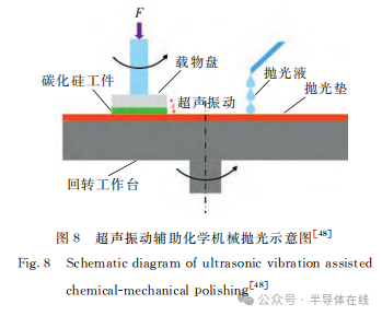 超聲振動輔助化學(xué)機械拋光(UVACMP)是一種經濟有效地提高SiC單晶拋光性能的技術。通過超聲(shēng)波發生器將電信號轉換成超聲振動,超聲振(zhèn)動作用在拋光區(qū),使拋光液中磨料更加分散,並且使磨(mó)料獲得(dé)一定動(dòng)能,加大了拋光中的機械作(zuò)用,同時振動過(guò)程中產生的熱促進了拋光(guāng)中的化學作用,超聲振動輔助化學機械拋光示意圖如圖8所示。
