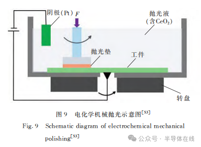 電化學機械拋光(ECMP)示意(yì)圖如圖9所示。ECMP是一種利用電解(jiě)液作為拋光液,將工件(jiàn)的電化學腐蝕與機械拋光(guāng)相結合的精密工藝(yì)。在單晶SiC(作為陽極)表麵(miàn)帶電後通(tōng)過(guò)陽極氧化(huà)產生氧化層,然後用軟磨料機械去除氧(yǎng)化層,最(zuì)後獲得超光滑無損傷的表麵。