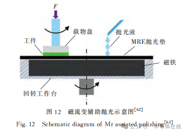 磁流變輔助拋光引入磁流(liú)變彈性體(MRE),與化學機(jī)械拋光相結合,在外加磁場、磁性拋光墊、氧化還原反應的共同作用下,提高工件的材料(liào)去除率,降低表麵(miàn)粗糙度,實現對工件的超精密加(jiā)工。磁流變(biàn)輔(fǔ)助拋光示意圖如圖12所示。
