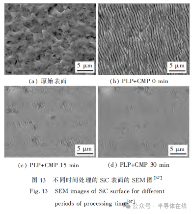 2021年,B.Gao等人提出了一種(zhǒng)皮秒激光輔助CMP方法,首先用皮(pí)秒激光對SiC的Si麵進行預(yù)處理(lǐ),然後進行(háng)拋光。結果表明:皮秒激光預處(chù)理(PLP)產生的波紋和多晶層改善了表麵加工性能,同時PLP氧化的C—O、Si—C—O和Si—O鍵易於材料去除。與非激光(guāng)預處理樣品相比(bǐ),激光預處理後樣品的材料去除率在拋光時前45 min顯著提高,而表麵粗糙度顯著降低,如圖13所示。2021年,G.P.Chen等人采用納秒激光(guāng)調製技術對SiCSi麵進行預處理。結果表明,該(gāi)技術可使表麵氧含(hán)量增加,且氧(yǎng)化物成分一致,用Al2O3拋光液拋光後,Ra低至0.081nm。