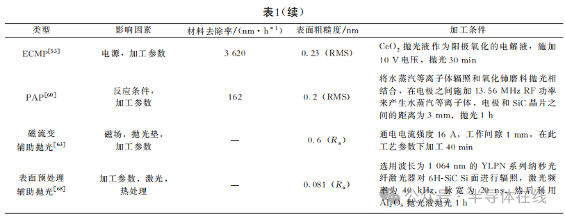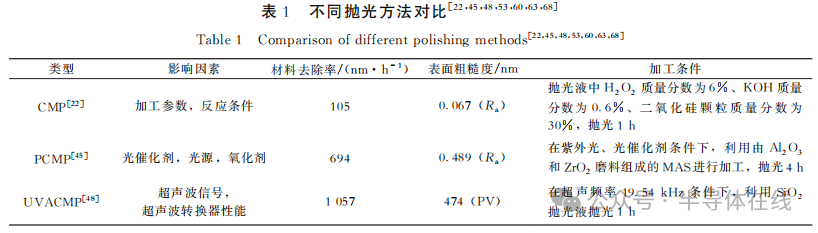 高效(xiào)率地獲得光滑表麵是半導體產業的一個(gè)關鍵問題,因此材料去除率和表麵粗糙(cāo)度被認為是評價單晶SiC拋光工藝兩(liǎng)個最重要指標。不同拋光方(fāng)法之間的對比如表1所示。