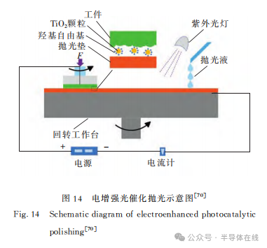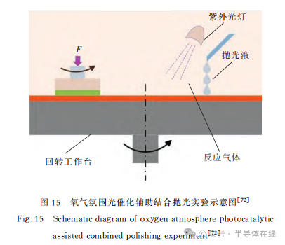 2021年,T.Yin等(děng)人采用高(gāo)濃度氧氣氛圍與光催化輔助拋光相結合,對SiC襯底CMP特性進行了(le)研究。結果表明:與常規空氣氣氛相比,將空氣氣氛中的氧(O2)分壓增加到300kPa,Si麵和(hé)C麵的材料去除率均增加超過2倍。實驗示(shì)意圖如圖15[72]所示。2022年,鄧家雲使用Fe3O4作為催化劑,對電Fenton化學機械拋光(guāng)進行(háng)了研究,利用電場參數控製CMP中·OH的生成速率和總濃(nóng)度,實(shí)現·OH的持續、穩定、可控生成,加速(sù)SiC的氧化腐蝕作(zuò)用,從而達到與磨粒去除(chú)的協同效應,最終MRR為2358nm/h、Ra為0.372nm。