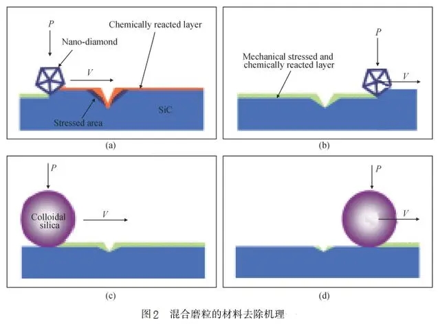 Park等將ZrO2磨粒與SiO2磨粒進行混合,Lee等將納米金剛石(shí)磨粒與SiO2磨粒混合,可以提升SiO2磨粒的研拋效率。在混合磨粒中,隨著(zhe)納(nà)米金剛石磨(mó)粒濃度的增加,材料的研拋效率(lǜ)也同(tóng)步增加;在研拋過程中,納米(mǐ)金(jīn)剛石磨粒主導工件表麵(miàn)材料(liào)的去除,SiO2磨粒則負責殘留機械加工痕跡的(de)去(qù)除。