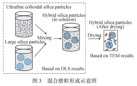 除了上述不同材質磨粒之間的(de)混合,還存在相同材質不同粒徑磨粒之間的混合。Lee等將粒徑為30nm和70nm的SiO2磨粒按比例(lì)進行混合,隨著兩種磨粒濃度(dù)比的改變,工件表麵材(cái)料的去除(chú)方式也發生兩體和三體磨粒去除的改變,當兩種磨粒(lì)質量比為2∶1時,材料去除方式為兩體磨粒去除,材料的去除率最高。Bun-Athuek等將(jiāng)粒徑為4nm的SiO2分別與20nm、55nm、105nm的(de)SiO2磨粒混合,混合磨(mó)粒的形成示意圖分別(bié)如圖3所示,發現超(chāo)細磨(mó)粒吸附在大粒徑磨粒外圍,改(gǎi)變(biàn)了大粒(lì)徑磨粒的形貌特征,提升了研拋效率。Lee等將粒徑為30nm的球形磨粒和70nm的(de)非球(qiú)形磨粒進行混合,相比球形SiO2磨粒,混合磨(mó)粒可顯著提升研拋效率;此(cǐ)外,提升球形磨粒(lì)在混合磨粒中的比例,可以改善(shàn)非球形磨粒(lì)的(de)切(qiē)削能力,提升研拋質量。