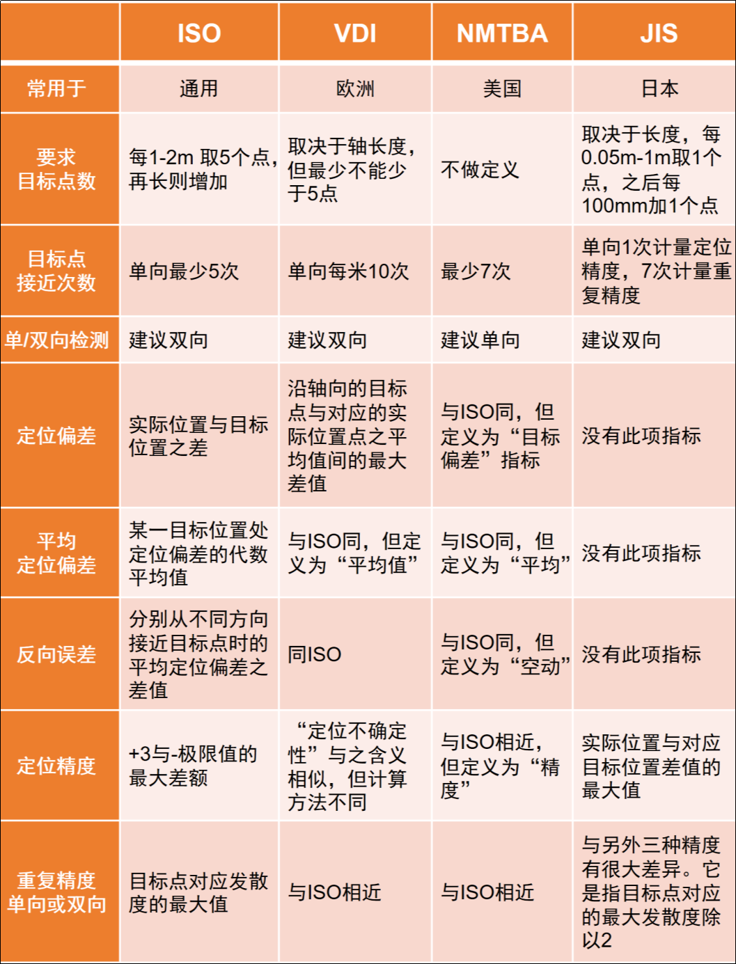 這是4種標準的關鍵區別點(diǎn)描述,正如人們所期待的,總有一天,所有機床生產商(shāng)都統一遵循(xún)ISO標準。因此,這裏選擇ISO標準作為基準。下表中(zhōng)對(duì)4種標準進行了比較(jiào),本文僅(jǐn)涉及線性精度(dù),因為旋轉精度的計算(suàn)原理與之基本一致。